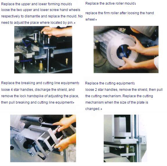 Adjust the machine without senior technicians and special tools after changing the size of plates and replacing the mould. The adjustment can be fulfilled in a short time.。